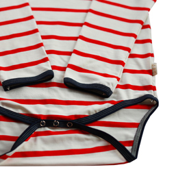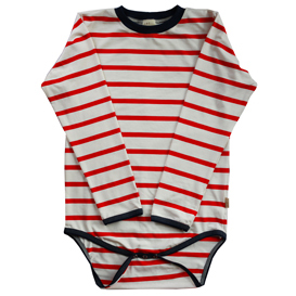 Nově bodytrička s červeným lemem, ve stejné barvě proužků.