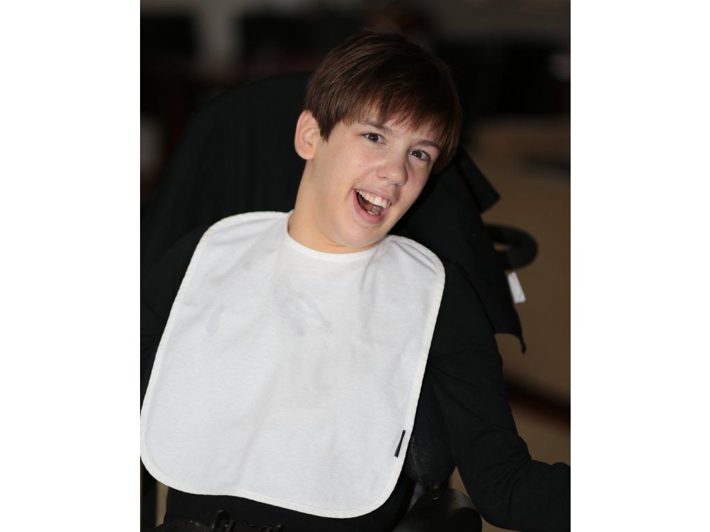 Bryndák má jednoduchý funkční střih a praktické zavazování na šňůrky, díky kterému jej lze snadno přizpůsobit obvodu krku. Je vhodný pro starší děti, dospívající i dospělé s postižením.
