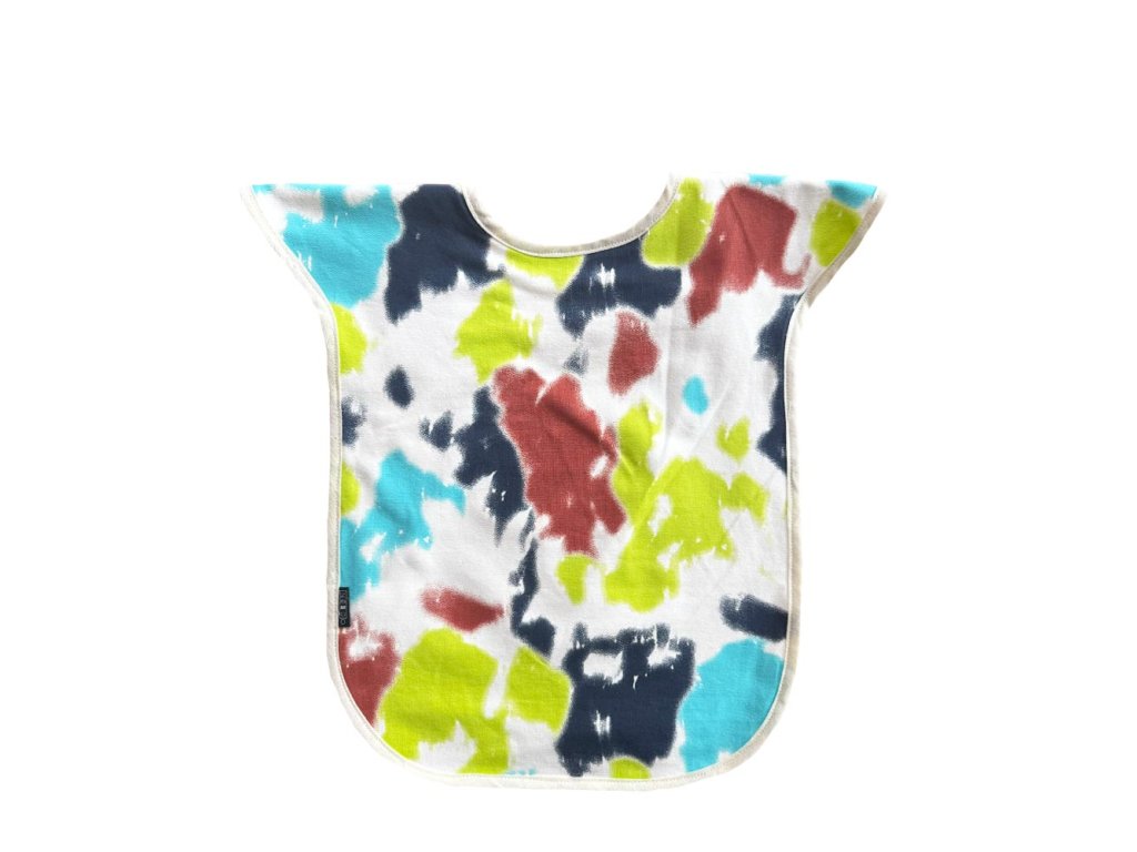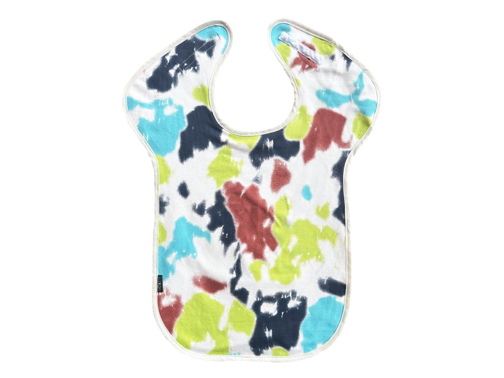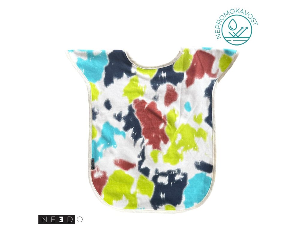 Nepropustný praktický bryndák s rozšířeným krytím ramen je ušit z bavlněného úpletu se vzorem a bavlněného úpletu s nepropustnou membránou ze spodní strany. Univerzální jedna velikost vhodná pro větší děti nebo dospělé se zvýšeným sliněním zejména na ramena s otočením hlavy do jedné strany. Zapínání za krkem je na druky, díky kterým je možné mírně upravit obvod kolem krku.
