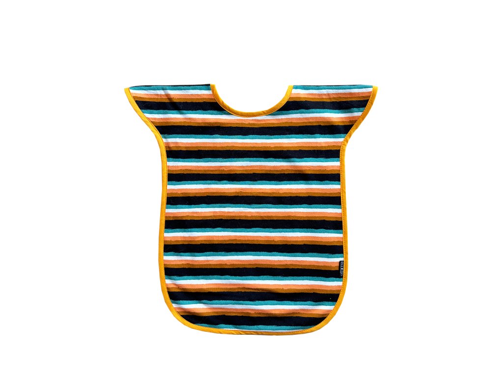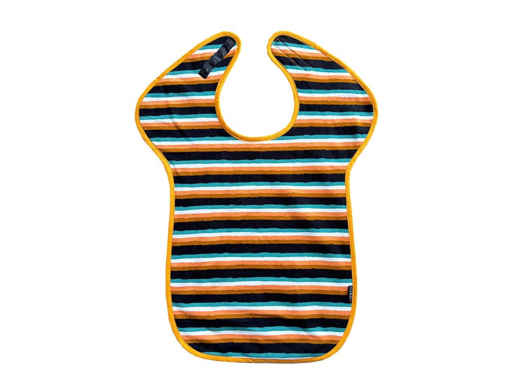Nepropustný praktický bryndák s rozšířeným krytím ramen je ušit z bavlněného úpletu se vzorem a bavlněného úpletu s nepropustnou membránou ze spodní strany. Univerzální jedna velikost vhodná pro větší děti nebo dospělé se zvýšeným sliněním zejména na ramena s otočením hlavy do jedné strany. Zapínání za krkem je na druky, díky kterým je možné mírně upravit obvod kolem krku.