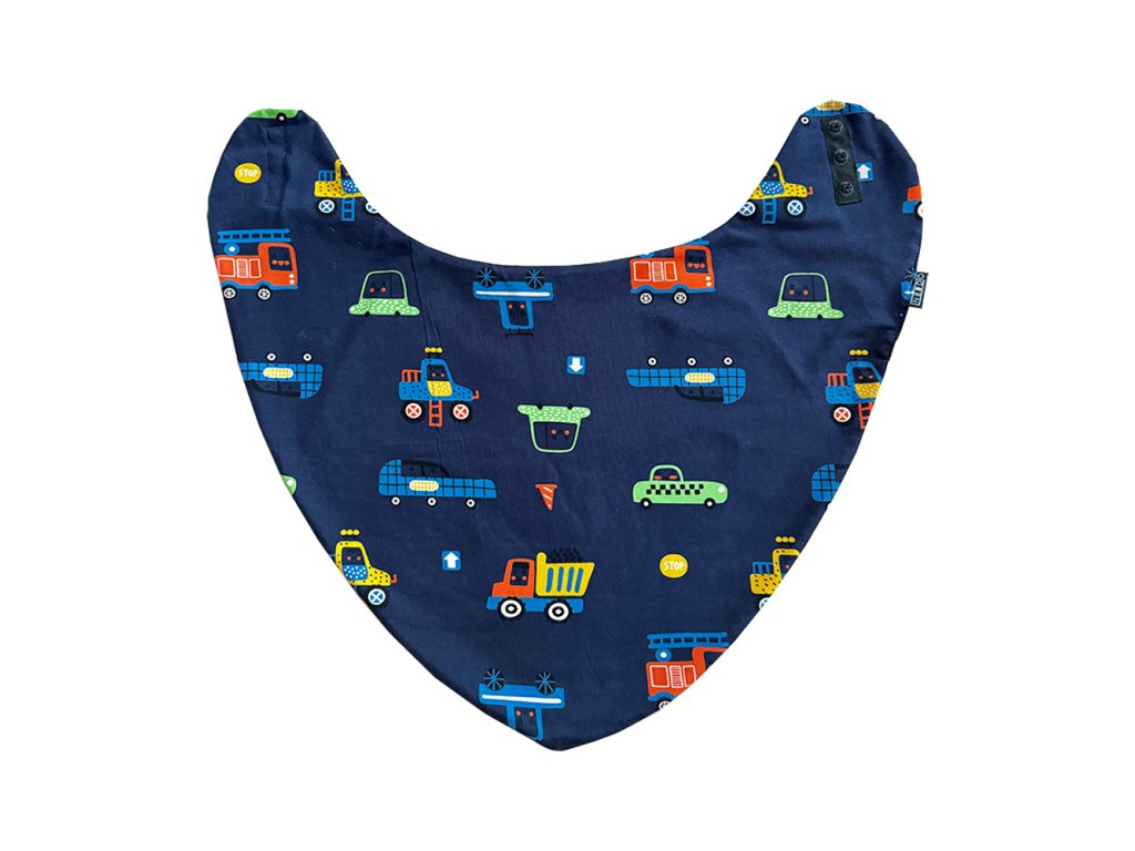 Funkční bryndák ve tvaru klasické šátky s extra absorpční vložkou je ušit ze splývavého bavlněného materiálu z vnější strany, uvnitř s extra absorpční vložkou a dalším materiálem s PU zátěrem, který zabezpečuje nepropustnost. Šátek plní funkci ochrany oblečení při zvýšeném slinění a svým vzhledem působí jako designový šátek kolem krku. Zapínání za krkem je na 3 plastové druky, díky kterým lze upravit obvod kolem krku.