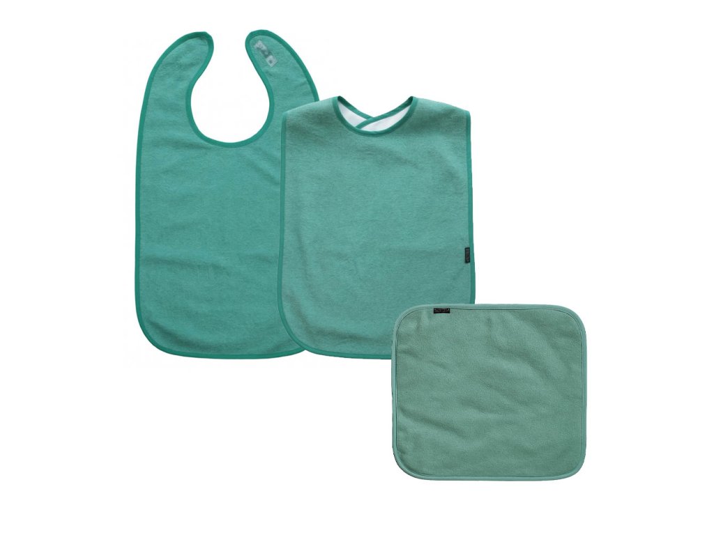 Nepropustné bryndáky z jemného froté v tvaru KLASIK a nepromokavá utěrka patří mezi praktické každodenní pomůcky.