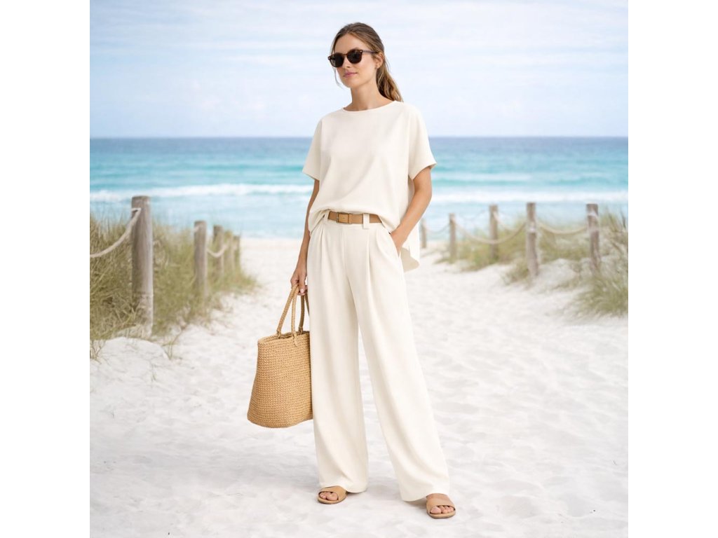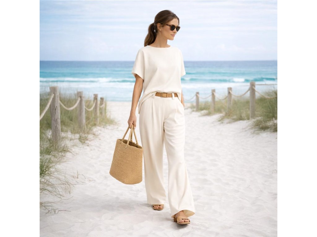 Pohodlný set trika a kalhot je ideální volbou pro každodenní nošení. Je ušit z jemného, splývavého a příjemného na nošení materiálu, který v teplejších dnech působí příjemně chladivě. Set je ideální do práce, na procházku, na cestování, na víkend i běžný den, kdy chcete být v pohodlí a zároveň upravená.