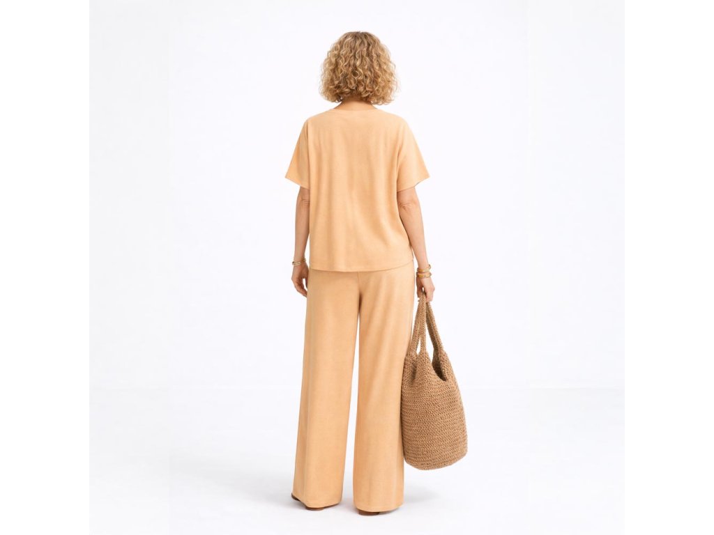 Pohodlný set trika a kalhot je ideální volbou pro každodenní nošení. Je ušit z jemného, splývavého a příjemného na nošení materiálu, který v teplejších dnech působí příjemně chladivě. Set je ideální do práce, na procházku, na cestování, na víkend i běžný den, kdy chcete být v pohodlí a zároveň upravená.