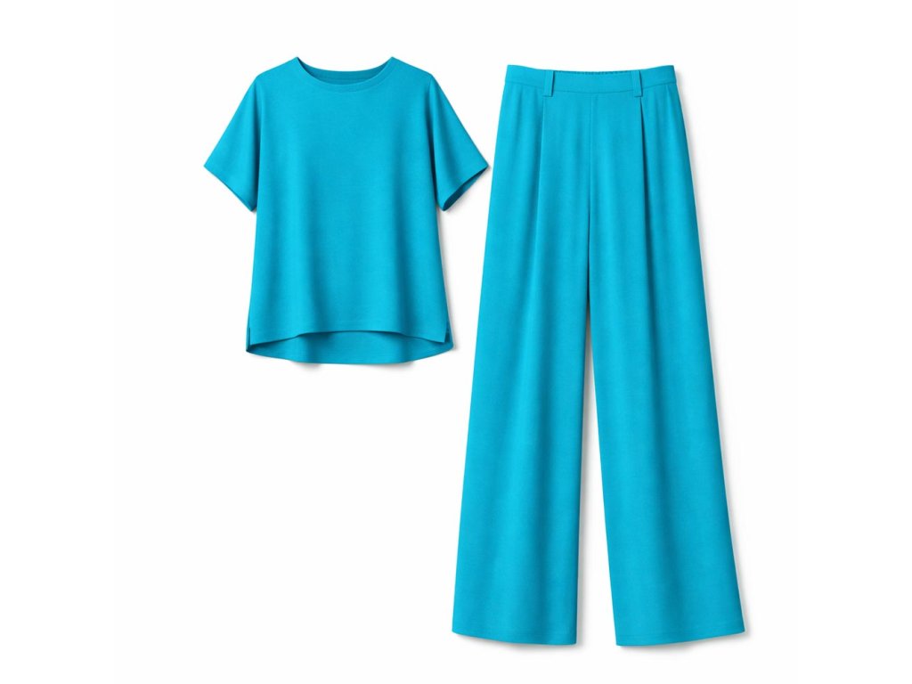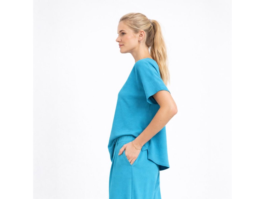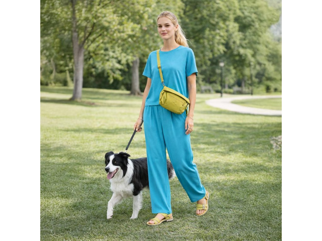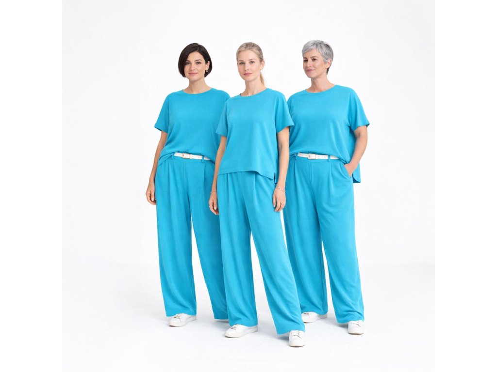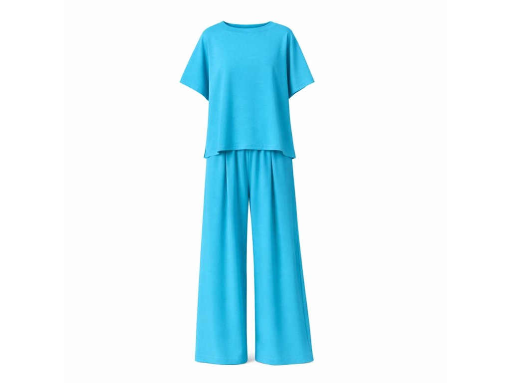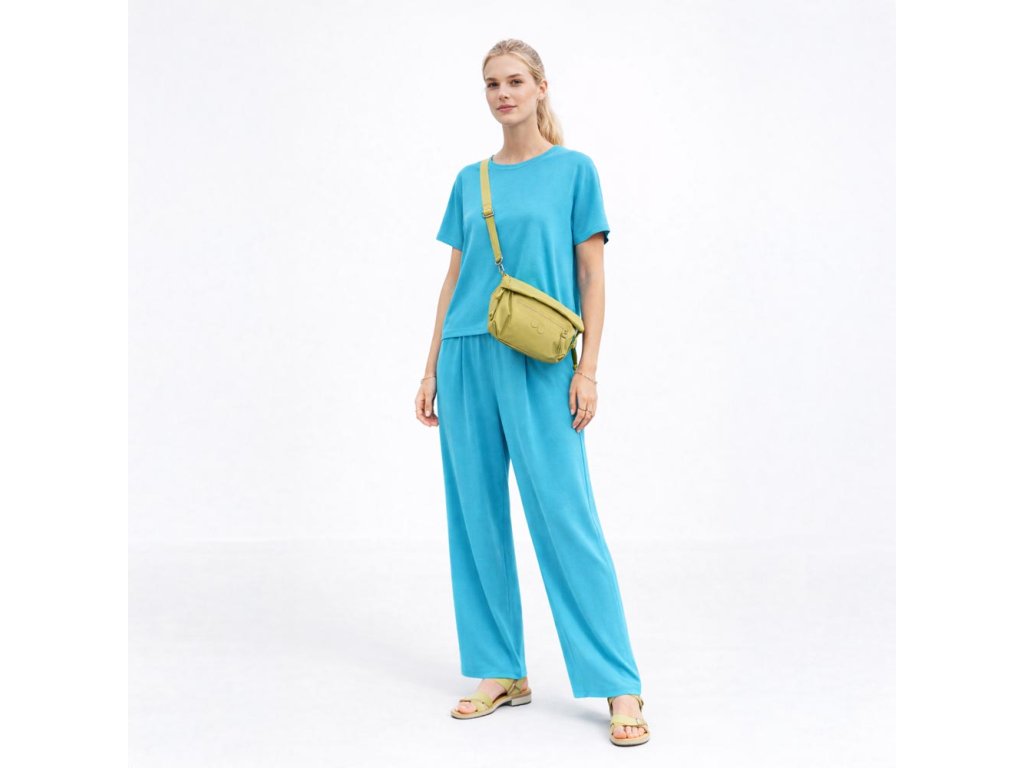 Pohodlný set trika a kalhot je ideální volbou pro každodenní nošení. Je ušit z jemného, splývavého a příjemného na nošení materiálu, který v teplejších dnech působí příjemně chladivě. Set je ideální do práce, na procházku, na cestování, na víkend i běžný den, kdy chcete být v pohodlí a zároveň upravená.
